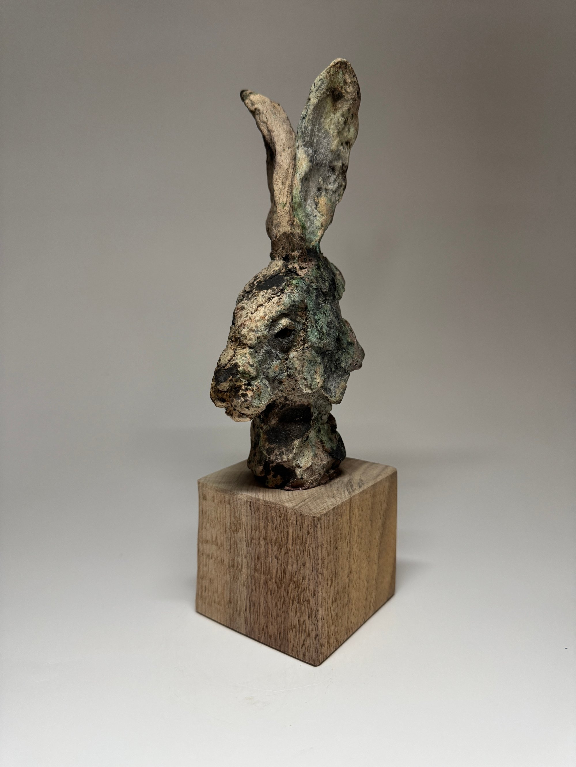 "Alex" has lots of beautiful greens and blacks and is mounted on a piece of rustic hardwood.